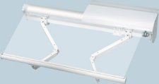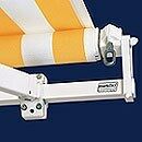 Gelenkarme mit ovalem Querschnitt und Gasfruckfedern für besonders straffen Tuchsitz. Grober Schmutz auf dem Markisentuch wird durch eine integrierte Bürste im Schutzdach beim Aufwickeln entfernt. |